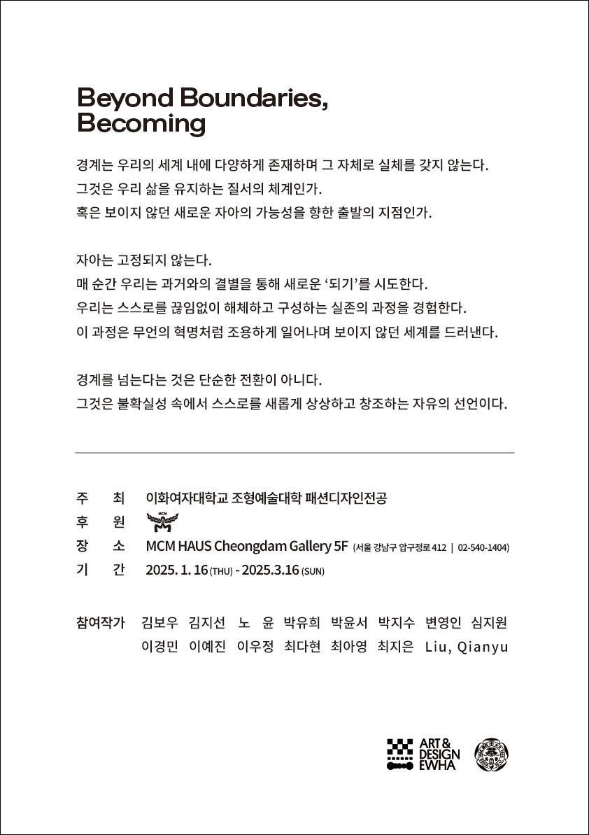 MCM 기업 후원으로 이루어지는 이화여자대학교 패션디자인전공의 작품전시에 초대합니다.